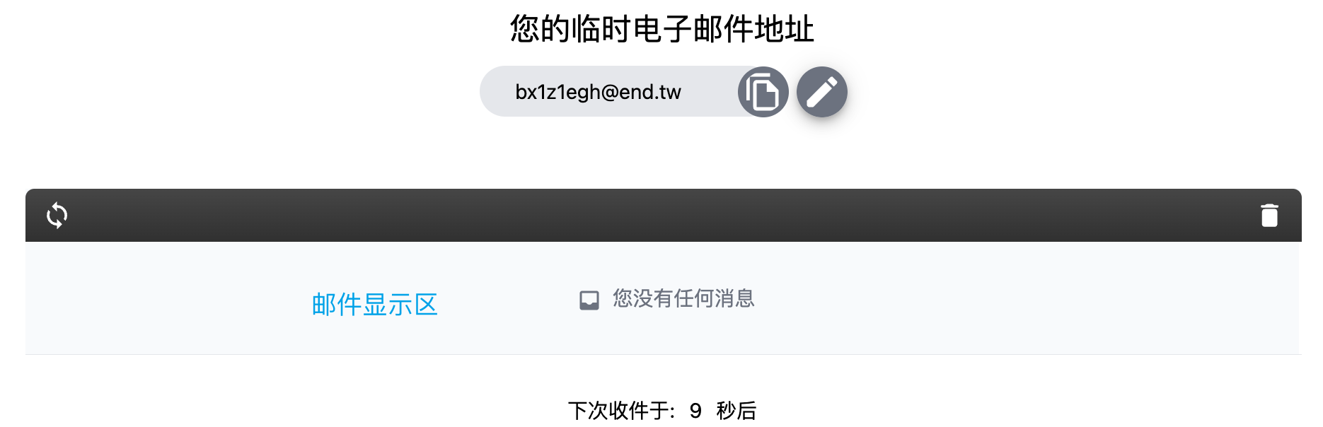 生成的邮箱账号会在框框内显示,新邮件9秒刷新一次,自测收件效率杠杠,邮件即时到;